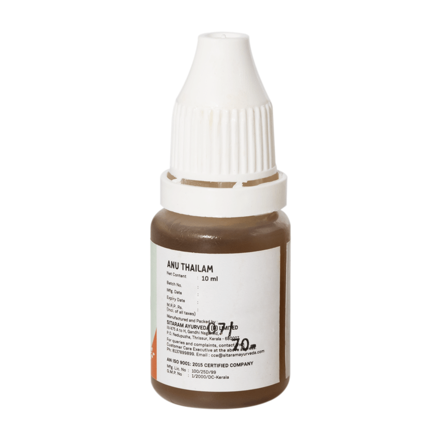 Made using the authentic reference from the classical textbook Astangahridaya, Sitaram?s Anu Taila is a hundred percent natural, herbal, paraben-free product indicated for Nasya. Anu Taila is praised for its action on the diseases of the head and neck, and also respiratory conditions. Even healthy people can do Nasya with Anu Tailam regularly, as its effects go far beyond disease management.