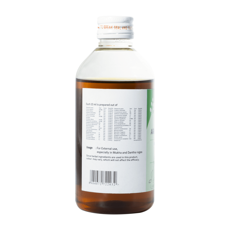 Arimedadi thailam is used for toothache, weak and loose teeth, loss of enamel and chipping of teeth, gingivitis, bleeding gums, halitosis, weakness of sense and loss of function in sense organs, allergic rhinitis, chronic sinusitis etc.