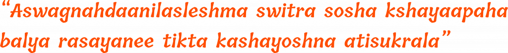 Translated as – Aswagandha pacifies Vata and Kapha doshas, cures switra (white pigmentation of skin), sosha (emaciation) and kshaya (wasting) ; is balya (strengthening), rasayanee (rejuvenating), tikta-kashaya (bitter and astringent to taste), ushna (hot in potency), atisukrala (promoting fertility).