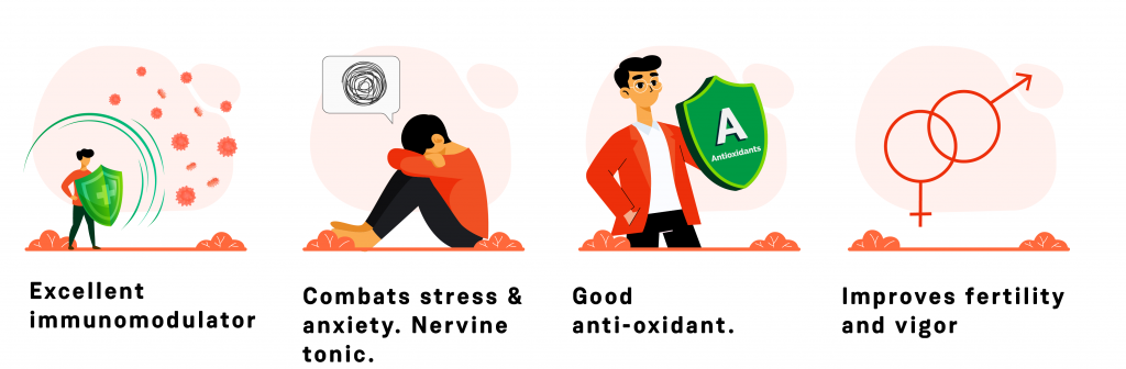 Indian Ginseng or Ashwagandha is a herb revered by the Ayurvedic scriptures for its superlative Rasayana properties. Several studies bear testimony to the potent antioxidant activity of Aswagnadha in its various forms. It boosts general endurance and immunity, improves metabolism and enhances sexual health and virility.