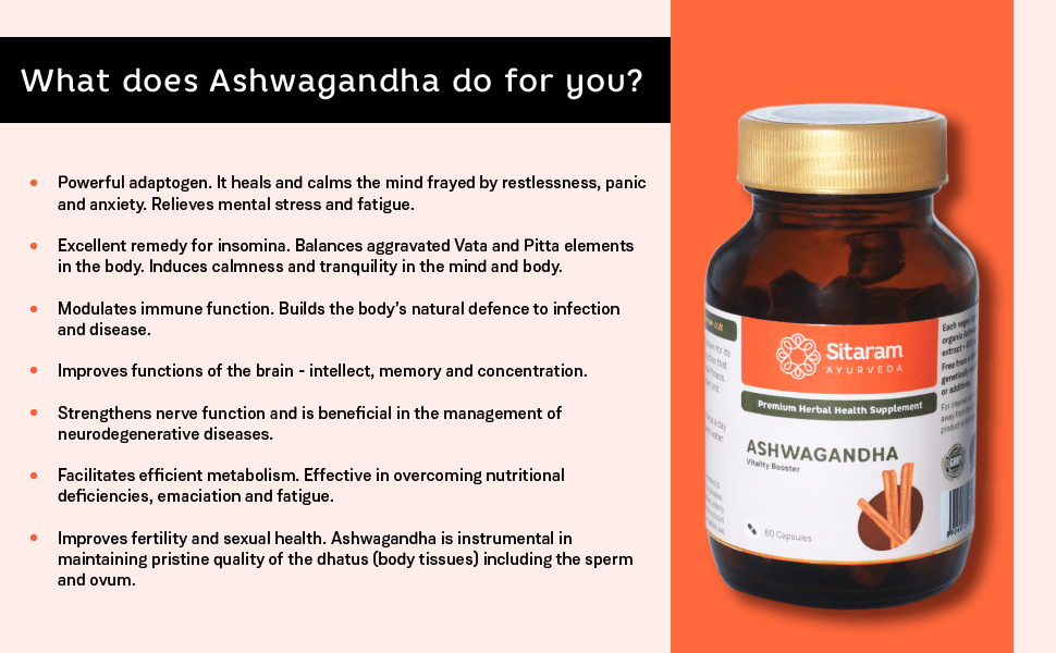 - Improves fertility and sexual health. Aswagandha is instrumental in maintaining the pristine quality of the Dhatus (body tissues) including the sperm and ovum.