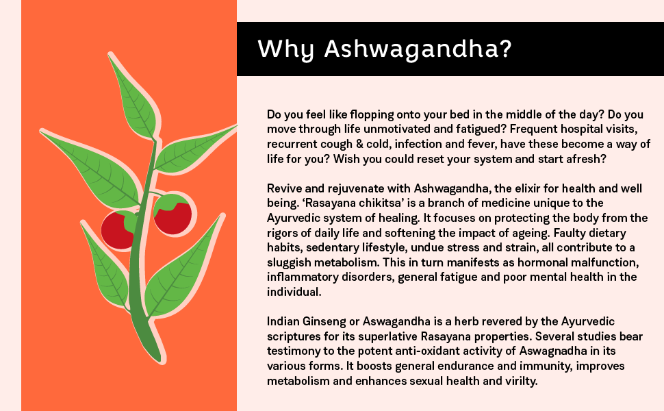 Revive and rejuvenate with Aswagandha, the elixir for health and well-being. ?Rasayana Chikitsa? is a branch of medicine unique to the Ayurvedic system of healing. It focuses on protecting the body from the rigors of daily life and softening the impact of aging. Faulty dietary habits, sedentary lifestyle, undue stress and strain, all contribute to a sluggish metabolism. This in turn manifests as hormonal malfunction, inflammatory disorders, general fatigue, and poor mental health in the individual.