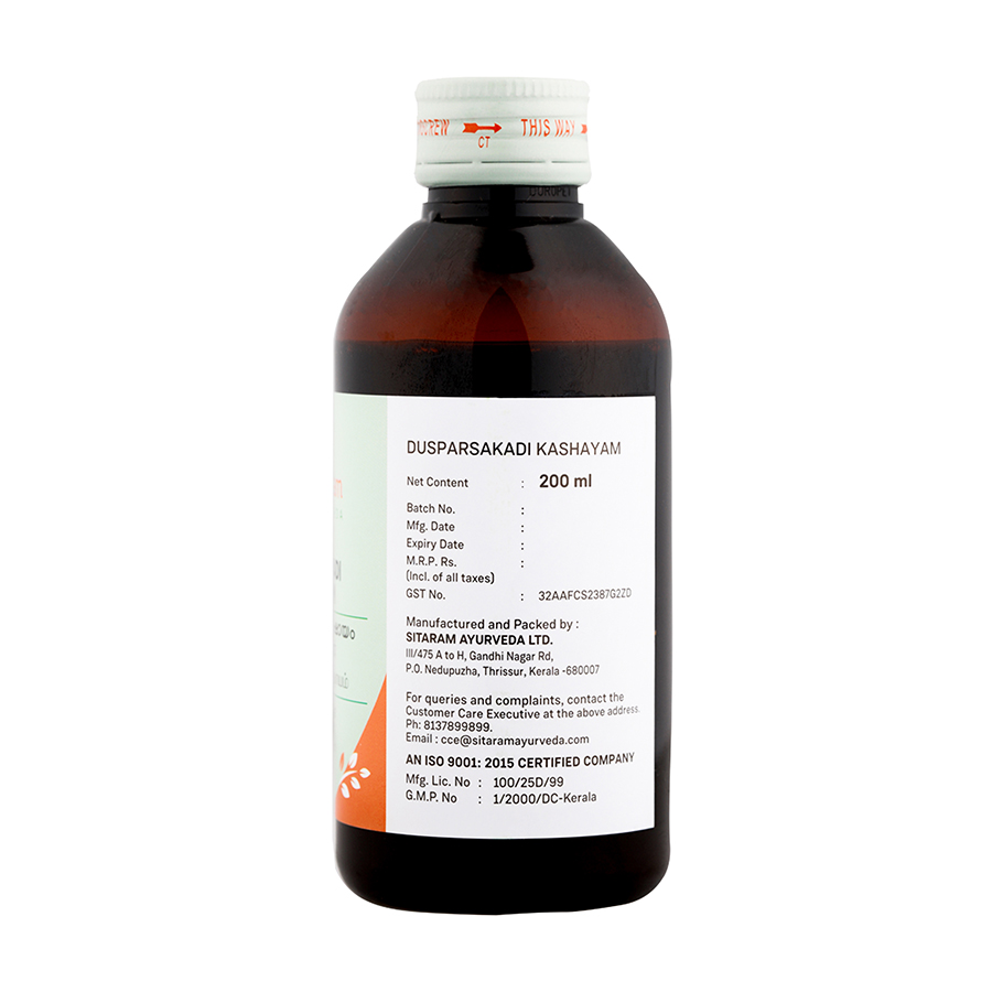 Dusparsaka (Tragia involucrata), Vilwa (Aegle marmelos), Jeeraka (Cuminum cyminum), Nagara (Zingiber officinale), and Patha (Cyclea peltata) are potent ingredients of this Kashaya that revive and nurture the ?Jatharagni? in the body. A competent digestive fire or metabolic agency is central to the Ayurvedic concept of health. Dusparsakadi Kashayam is used largely for managing diseases arising from ?Apana Vata? derangement like piles, fistula and constipation.