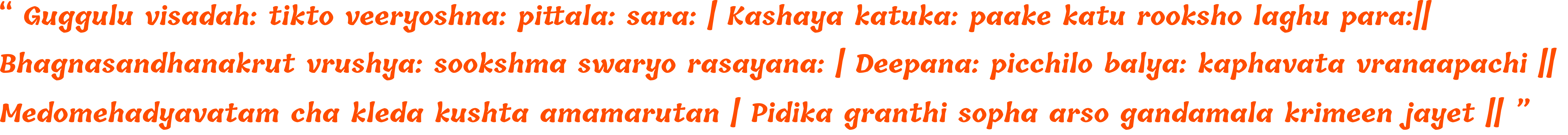 Translated as – Guggulu has Tikta Katu Kashaya Rasa (bitter pungent astringent taste), Laghu Rooksha Guna (light and dry qualities), Ushna Veerya (hot potency), and Katu Vipaka (hot after digestion).