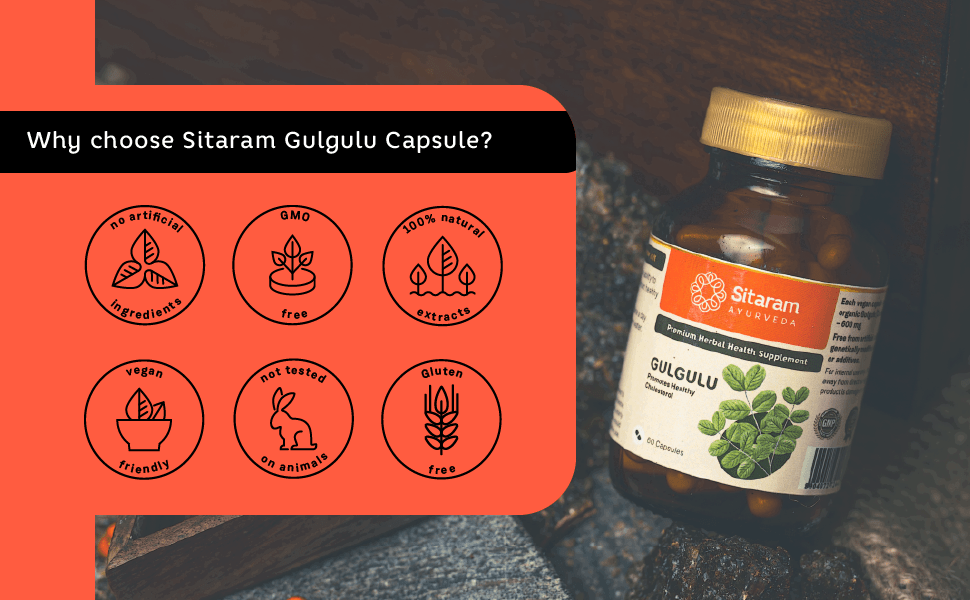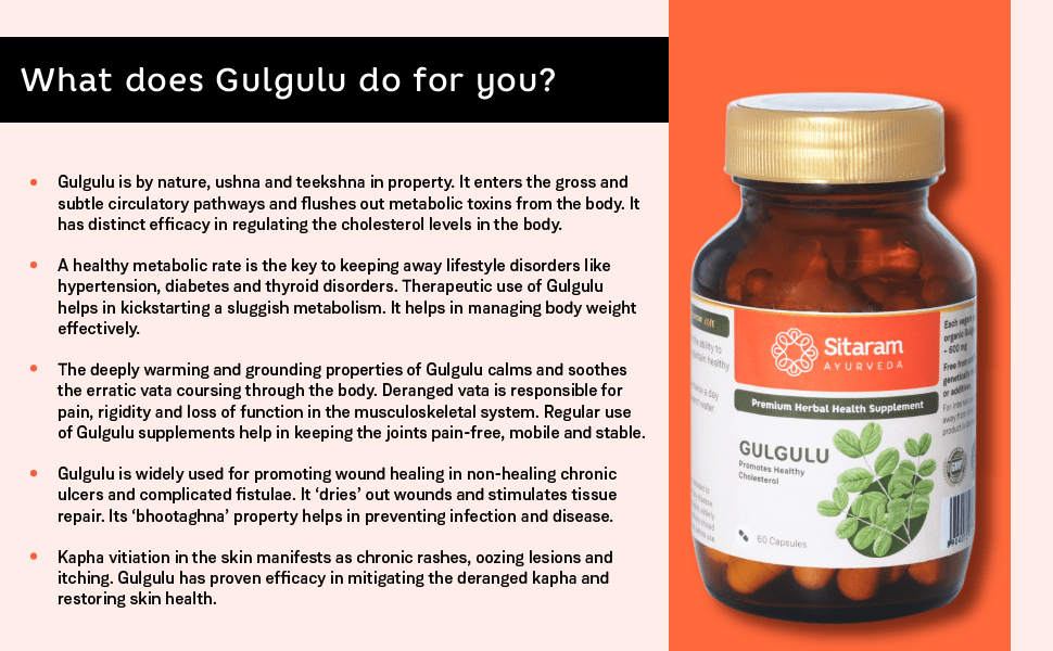 - Guggulu is by nature ushna and teekshna in the property. It enters the gross and subtle circulatory pathways and flushes out metabolic toxins from the body. It has distinct efficacy in regulating the cholesterol levels in the body.