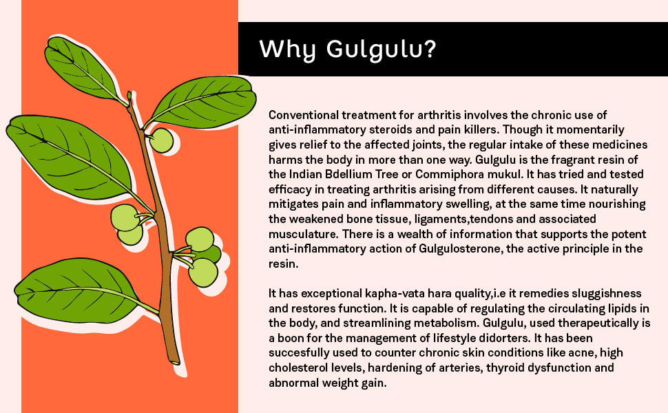 Guggulu is the fragrant resin of the Indian Bdellium Tree or Commiphora Mukul. It has tried and tested efficacy in treating arthritis arising from different causes. It naturally mitigates pain and inflammatory swelling, at the same time nourishing the weakened bone tissue, ligaments, tendons and associated musculature. There is a wealth of information that supports the potent anti-inflammatory action of Guggulosterone, the active principle in the resin.