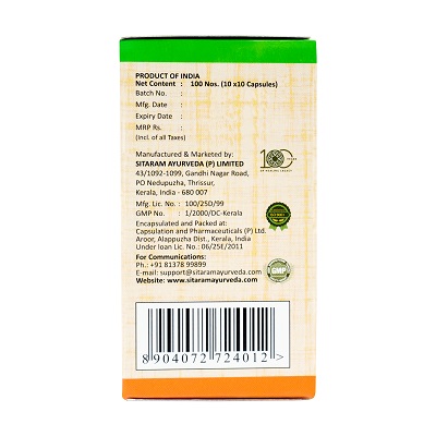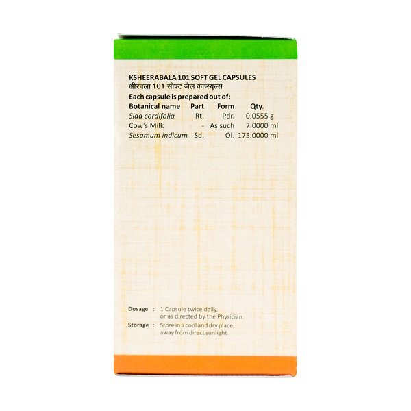 ‘Avartana’ is a method of enhancing the potency of herbal remedies that is specific to Ayurveda drug design concepts. Ksheerabala 101 soft gel capsules are a sesame oil base that has been treated 101 times with the medicinal powers of Bala and Ksheera. The severe Vata hara property of Bala and Pitta samana property of Ksheera are amplified a hundredfold in the ensuing Avarti preparation.