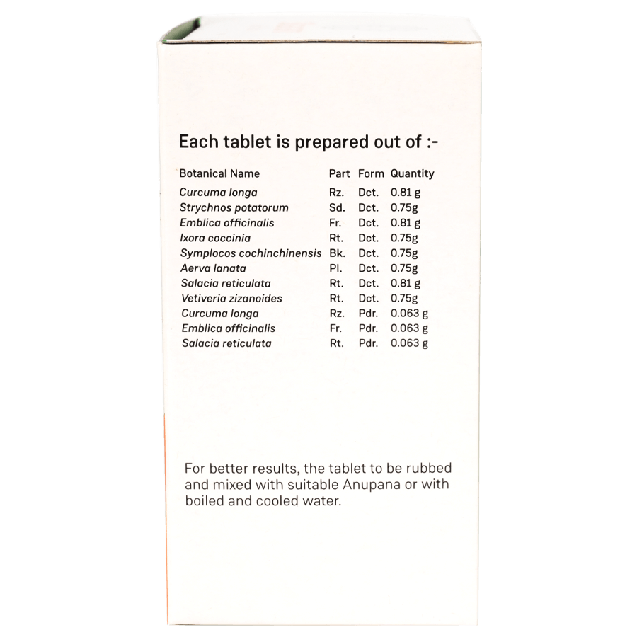 Nisakathakadi Kashayam tablet is useful in the Manangement of high blood sugar levels, obesity and insulin resistance, diabetic complications like neuropathy, nephropathy, retinopathy and diabetic carbuncles.