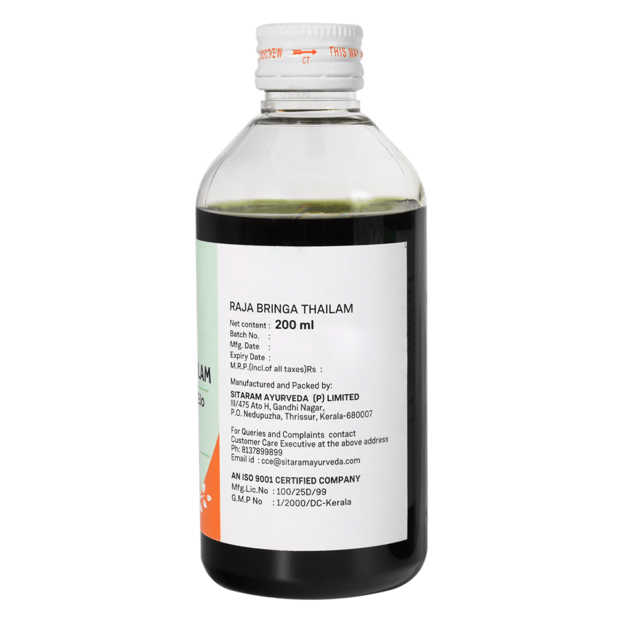 Rajabhringa Tailam arrests premature greying, prevents hairfall and breakage, cures dandruff strengthens dull and lustreless hair, relieves chronic sinusitis and allergic rhinitis. Beneficial for eyes.