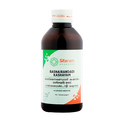 Vata in its element is responsible for smooth locomotory function and nerve conduction. Rasnadi Kashayam is lauded for its therapeutic efficacy in ensuring sustained pain relief. ?Soola? in Ayurveda denotes deep piercing pain in a given body part. Rasnadi Kashayam or Rasnairandadi Kashayam is capable of relieving such pain in the arms, thighs, hips, back, lower back and flanks.