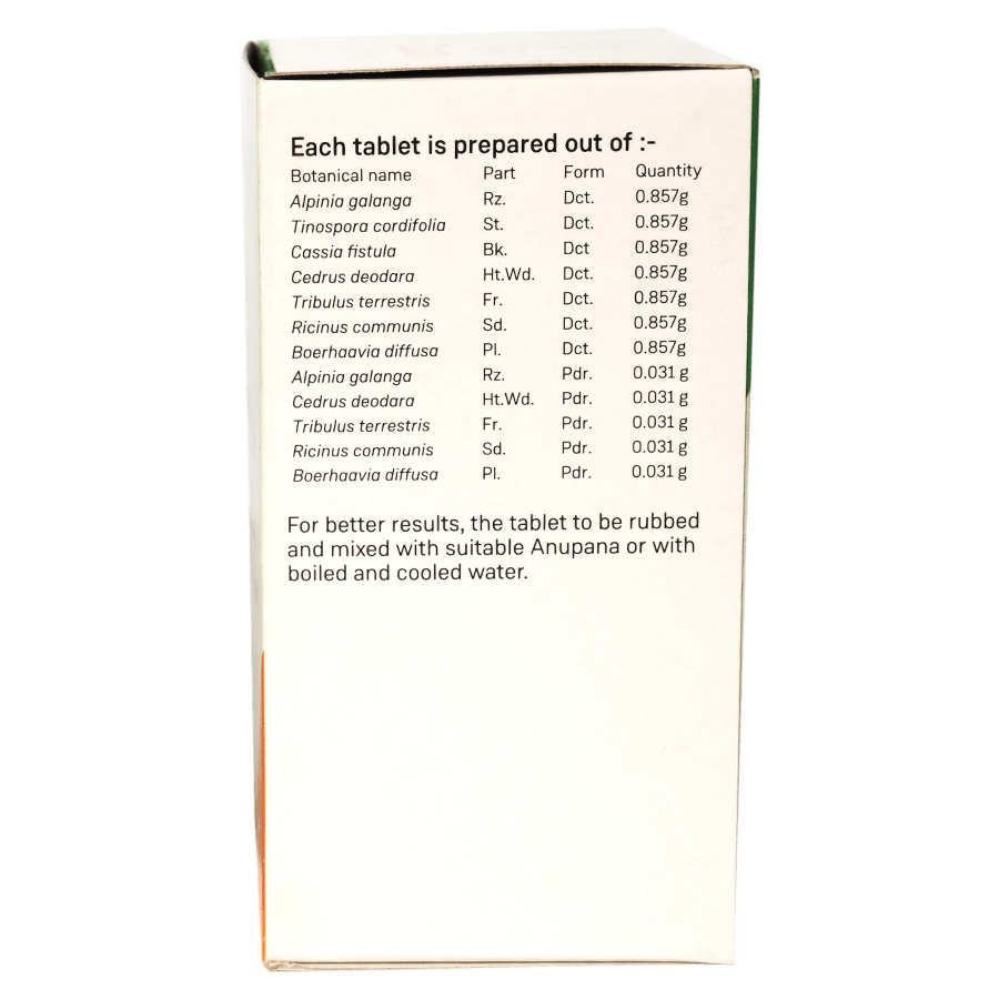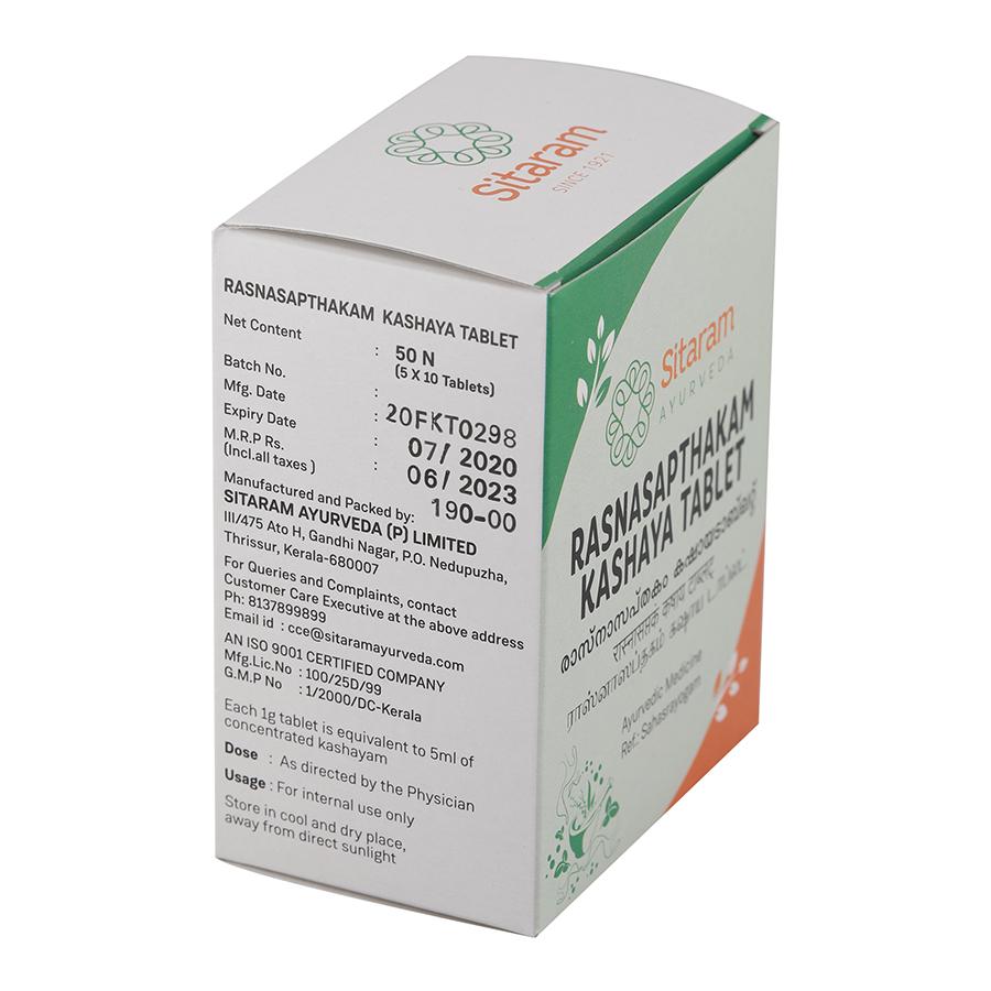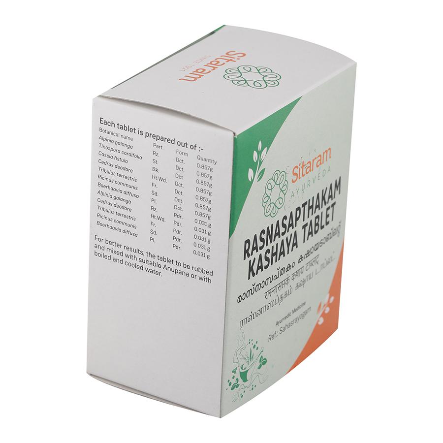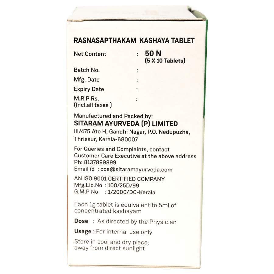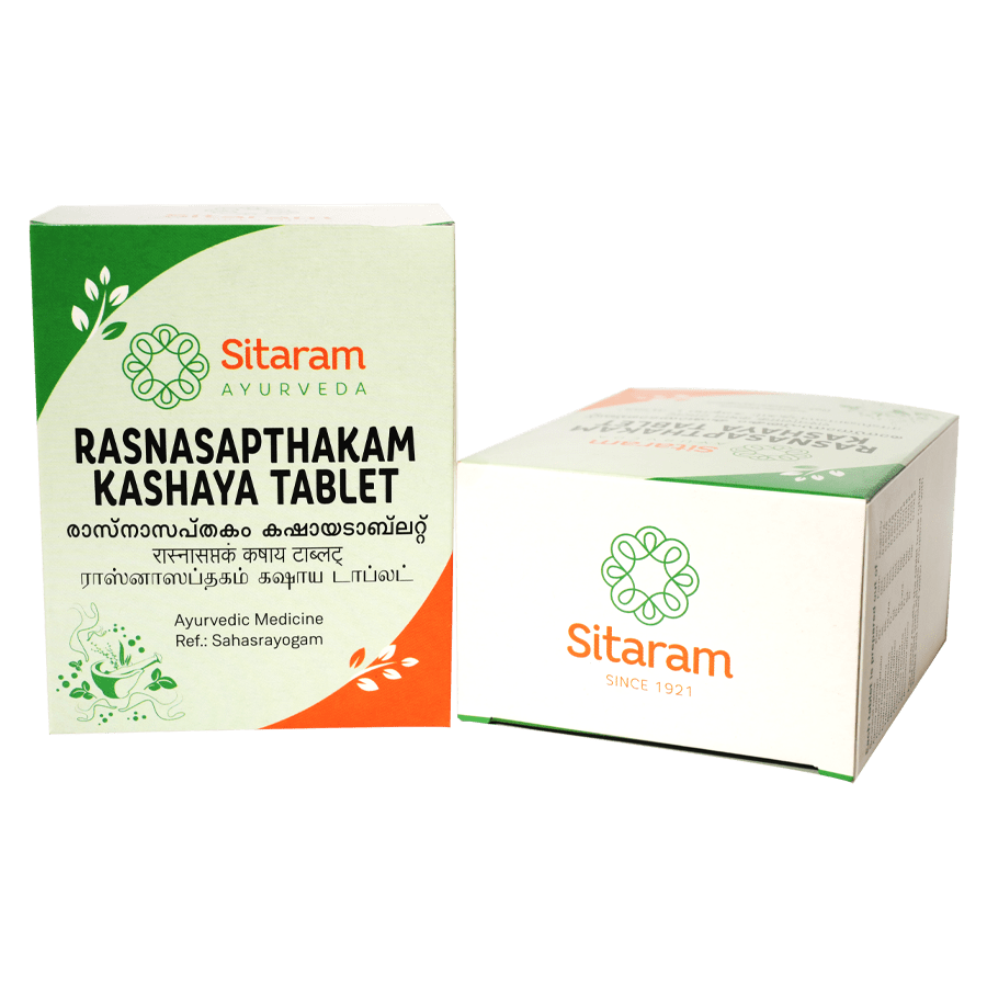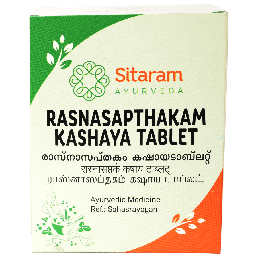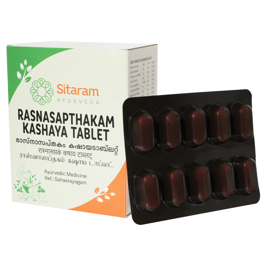 ?Kashaya? or herbal decoctions harness the healing properties of herbs and roots in a mild and easily absorbable water base. The tablet modification of Rasnasaptakam Kashayam allows easy transportation and administration, without compromising on its therapeutic benefits.