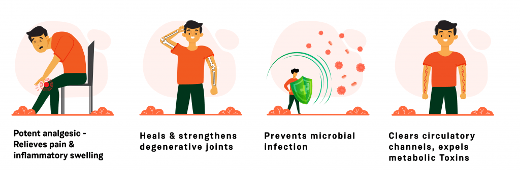 Derangement of Vata elements in the body ravages the body from within. It courses through the body causing degeneration and loss of function in its wake. The affected joints and musculature become weak and wasted. Inflammation sets in, giving rise to pain – pain in executing the normal functions of the body, pain in doing routine activities, pain even at rest.