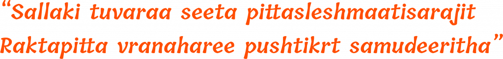 Translated as – Shallaki is bitter to taste, cold in potency, and relieves diseases of Pitta-Sleshma origin and Atisara (diarrhoea). It alleviates raktapitta and vrana, is nourishing (pushitkrt).