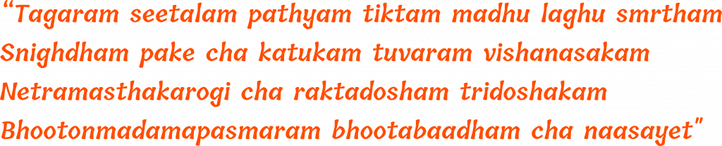 Translated as – ?Tagara is Seetala (cold potency), Pathya (conducive to the body), having Tikta Madhura Rasa (bitter sweet taste) and Laghu Snigdha Guna (light and unctous properties). It has Katu Vipaka (hot energetics) and is Vishanasaka (neutralises toxins and poisons) and is beneficial in treating diseases of the eyes and head, Raktadosha and Tridosha imbalance. It mitigates Unmada (psychotic imbalance), Apasmara (convulsive disorders), and Bhootabaada (afflictions by foreign bodies).?