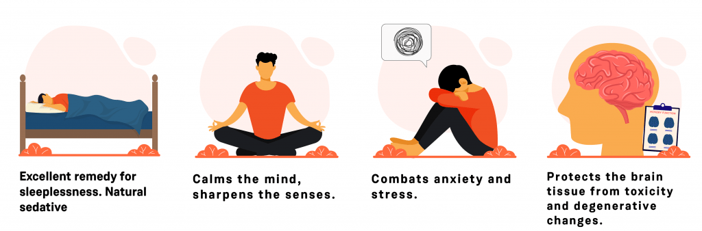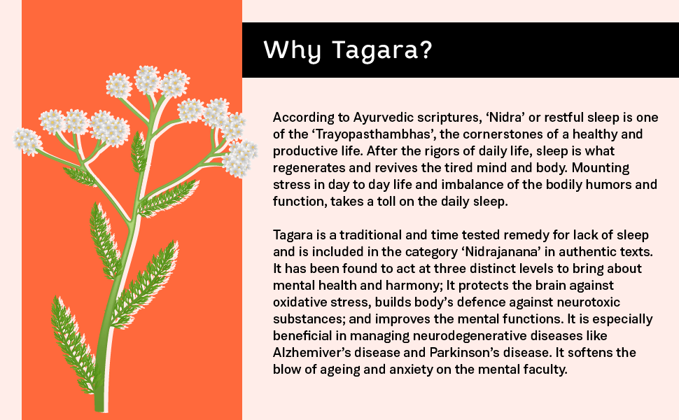 Tagara, a traditional and time-tested remedy for lack of sleep and is included in the category ?Nidrajanana? in authentic texts. It has been found to act at three distinct levels to bring about mental health and harmony. It protects the brain against oxidative stress, builds the body?s defense against neurotoxic substances, and improves mental functions. It is especially beneficial in managing neurodegenerative diseases like Alzheimer’s disease and Parkinson?s disease. It softens the blow of aging and anxiety on the mental faculty.