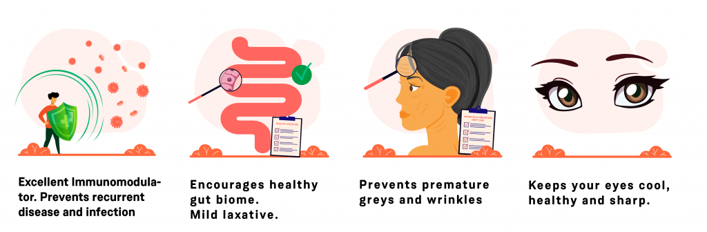 - Bestows healthy hair, skin, and eyes. Improves clarity and sharpness of vision. It is routinely used in managing vision acuity problems, early-onset cataracts, and recurrent eye infections.