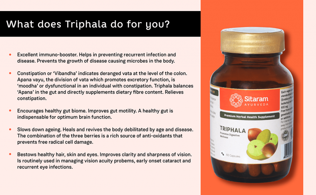 - Triphala is an excellent immuno-booster. Helps in preventing recurrent infection and disease. Prevents the growth of disease-causing microbes in the body.