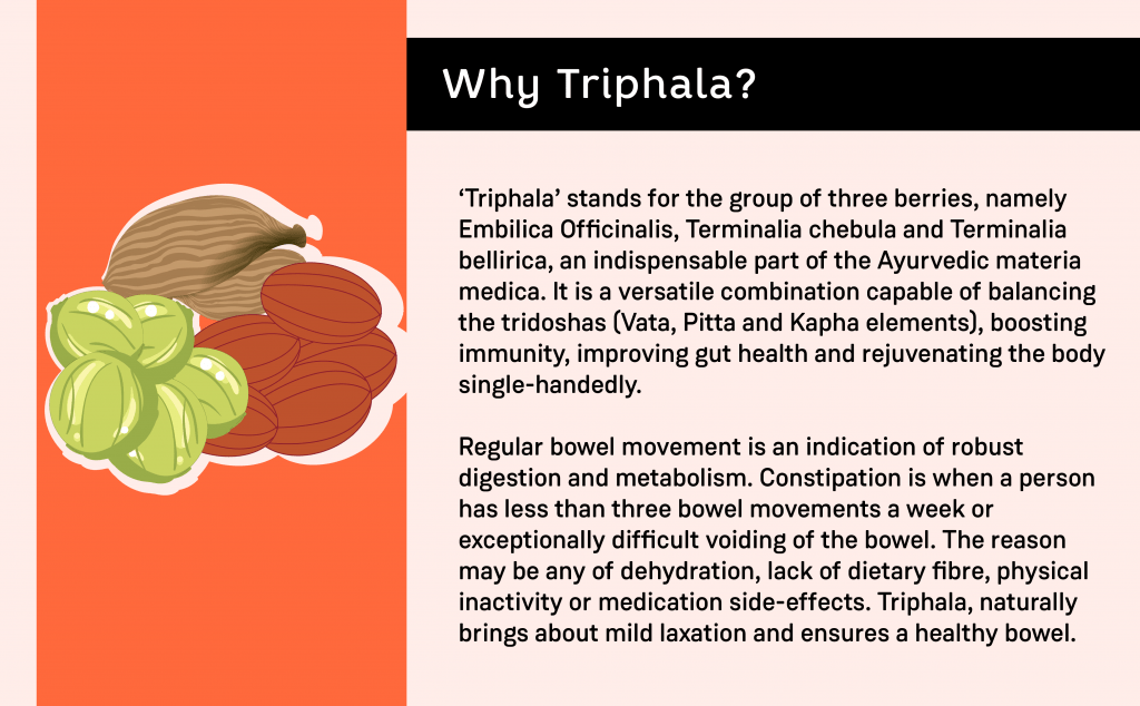 Triphala stands for the group of three berries, namely Embilica Officinalis, Terminalia chebula and Terminalia bellirica, an indispensable part of the Ayurvedic materia medica. It is a versatile combination capable of balancing the Tridoshas (Vata, Pitta and Kapha elements), boosting immunity, improving gut health and rejuvenating the body single-handedly.