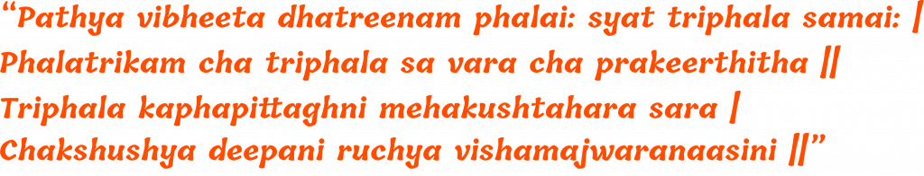 Translated as – Triphala choorna is the powder of Pathya, Vibheetaki and Dhatri in equal quantities. Also called Vara Choorna. Triphala is Kapha-Pittaghna (pacifies Kapha and Pitta), Meha-Kushta hara (alleviates Prameha and Kushta) and Sara (flowing) in nature. It is Chakshushya (beneficial for the eyes), Deepani (digestive), Ruchya (appetite-stimulating) and Vishamajwaranasini (alleviates Vishamajwara).