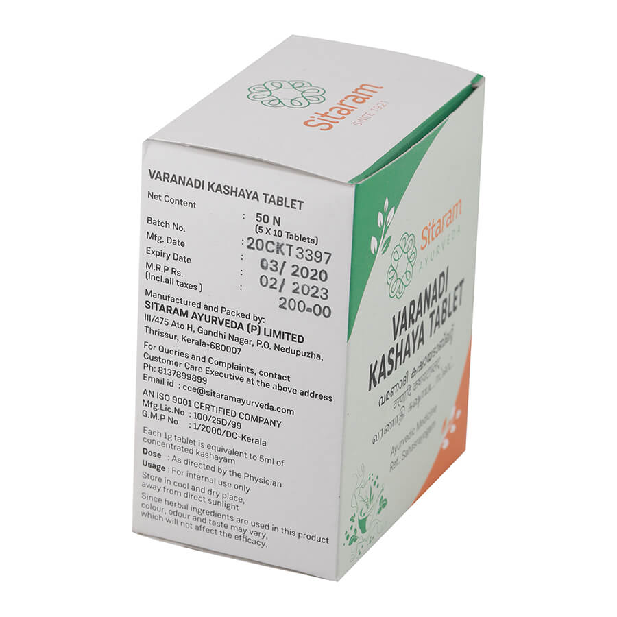 ?Kashaya? or herbal decoctions harness the healing properties of herbs and roots in a mild and easily absorbable water base. The tablet modification of Varanadi Kashayam uses allows easy transportation and administration, without compromising on its therapeutic benefits.